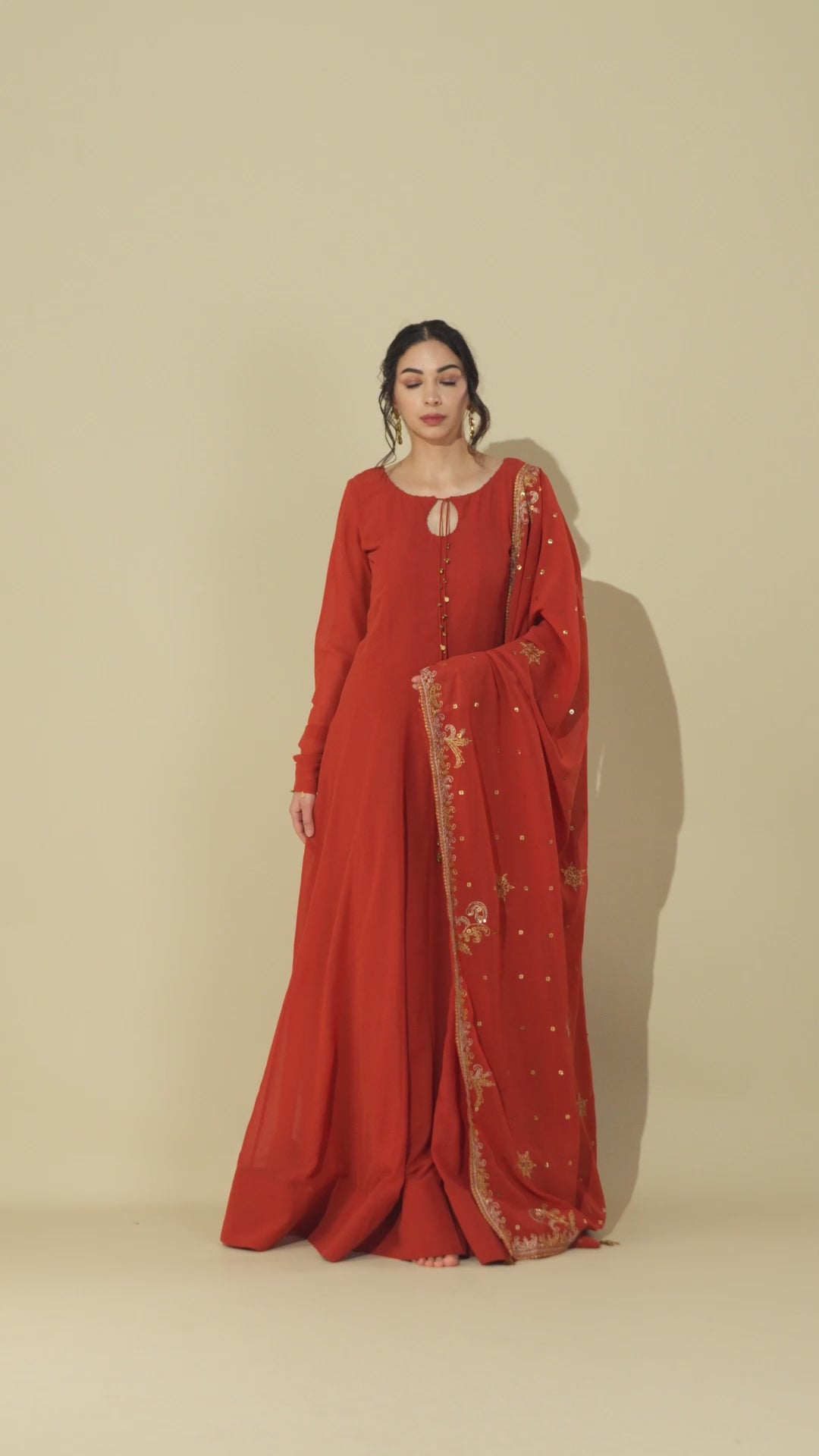 Look Absolutely Stunning in our ACHALA Anarkali Set Crafted from premium Georgette Fabric. The anarkali features a beautiful neckline with intricate hand finishings and dori finishings. This elegant design is artfully combined with a magnificently embroidered Odhani.