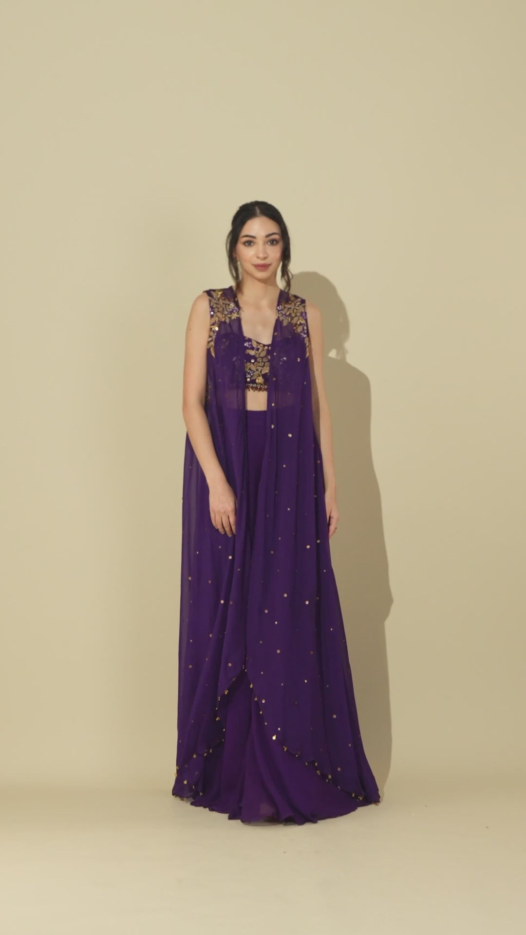 Elevate your style with the Amrit Jacket Set, a three-piece ensemble featuring a cape, blouse, and draped skirt, all in a chic purple hue. Crafted from premium organza and crepe, this set is finely detailed with multi-colored embroidery and meticulously hand-finished bound trimmings, showcasing expert craftsmanship. The rich purple color brings a touch of modern sophistication, while the embroidered cape adds a statement-making elegance. Perfect for parties, cultural events, and evening occasions, the Amrit Jacket Set is designed to turn heads and leave a lasting impression.