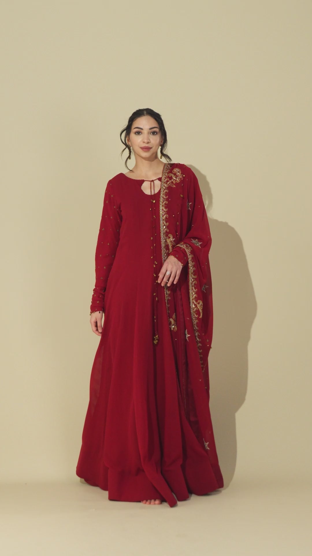 Look Absolutely Stunning in our ANAYA Anarkali Set Crafted from premium Georgette Fabric. The Anarkali features a beautiful neckline with intricate hand finishings and Dori finishings. This elegant design is artfully combined with a magnificently embroidered Odhni.
