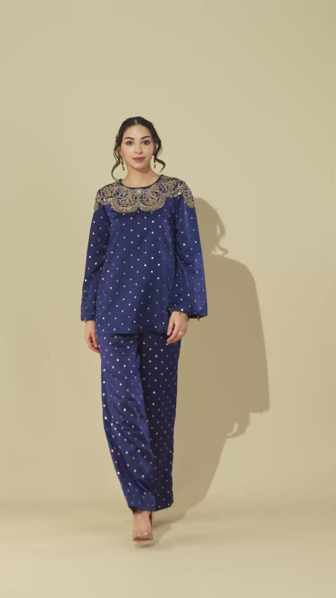 Look sharp & Stylist in our Avyukta Kameej + Pant set. Crafted from Luxurious satin, this exquiscite features beautifully embroidered kameez with detaiuled hand finishings paired with smart fit hand-embroidered pants to complete the look. This Co-ord set will make you look & feel glamorous.
