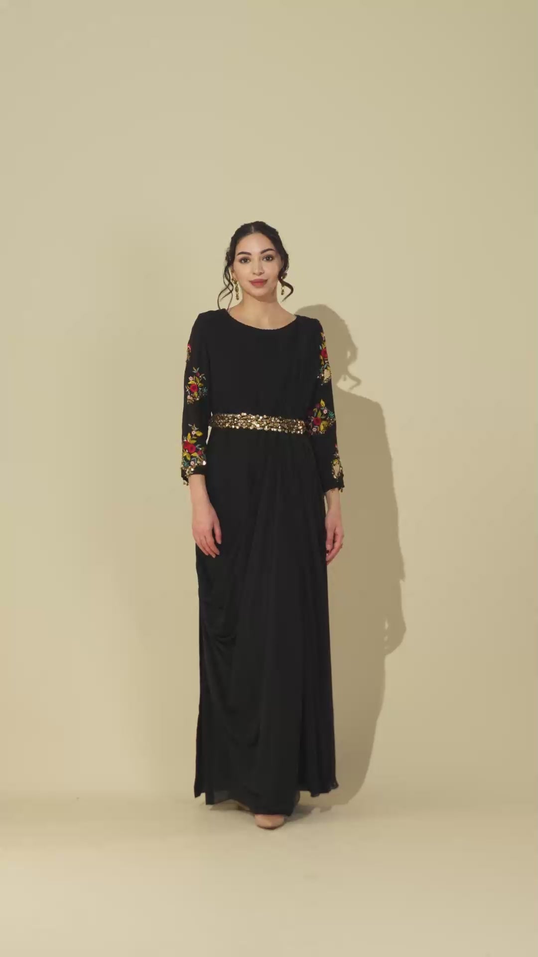 The Dayanidhi Draped Dress brings elegance with its premium black georgette fabric adorned with multi-color embroidery and intricate hand-crafted detailing. This two-piece ensemble (draped dress and belt) is a statement of sophistication and timeless design, complete with a hand-embroidered belt. Perfect for those looking to make an impression, this dress showcases exceptional craftsmanship.