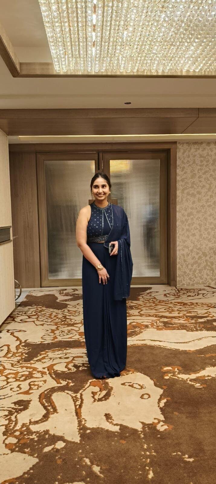 Experience opulence with our Mohnish Sari Set. Expertly crafted from premium georgette, each piece features intricate hand embroidery. The blouse features a beautiful neckline with eye-catching detailing and a show-stopping back, paired with a draped stitched saree. The set boasts intricate craftsmanship, perfect for intimate or formal occasions.