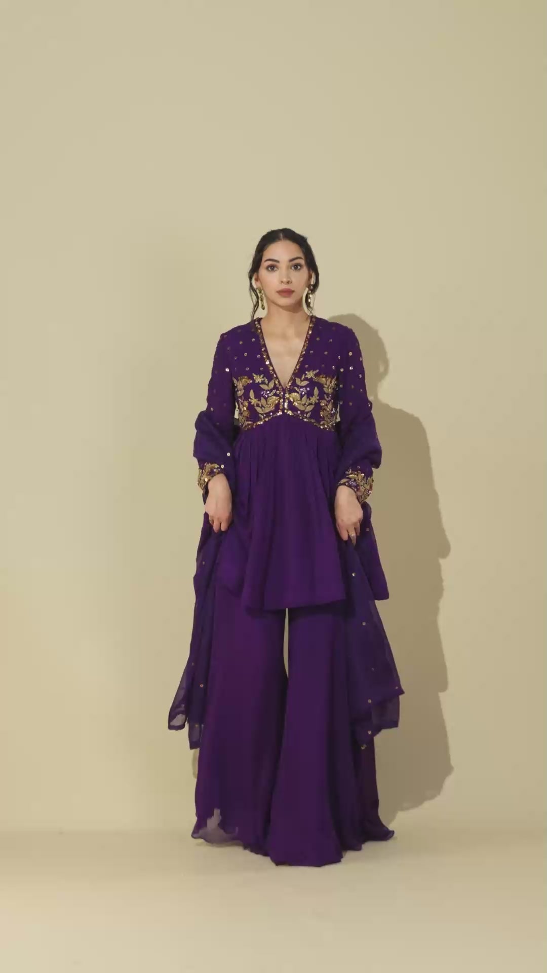 Introducing the luxurious NIRJUNA gathered sharara set, crafted from premium georgette and organza in a rich purple hue. This beautiful ensemble features an elegantly embroidered yoke top, paired with a flowy hand-embroidered sharara and a delicate embroidered odhni, creating a complete, sophisticated look. Ideal for festive occasions, weddings, and special celebrations, the NIRJUNA set combines traditional craftsmanship with modern elegance. The intricate details and vibrant color make this outfit a stunning addition to any wardrobe, perfect for those who love a touch of elegance.