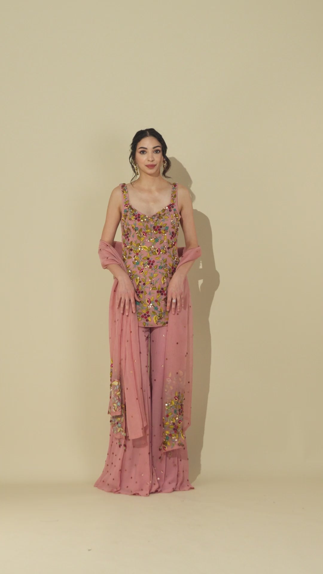 Elevate your style with the exquisite SAKSHI traditional wear set. This luxurious ensemble showcases a subtle pastel pink kurta adorned with intricate multi-color jari embroidery, adding a touch of sophistication and artistry. Paired with a beautifully hand-embroidered georgette sharara and a matching embroidered odhni, the SAKSHI set is designed for those who appreciate true craftsmanship.