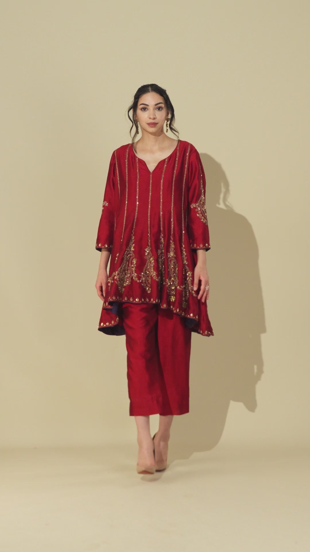 A perfect blend of tradition and contemporary charm. This set features a short, wine-colored kalidar Anarkali kurta paired with pants, exuding elegance and grace. Adorned with intricate gold embroidery, it adds a touch of royal allure to any occasion. Perfect for festive events, weddings, or celebrations, this outfit offers timeless sophistication with a modern
