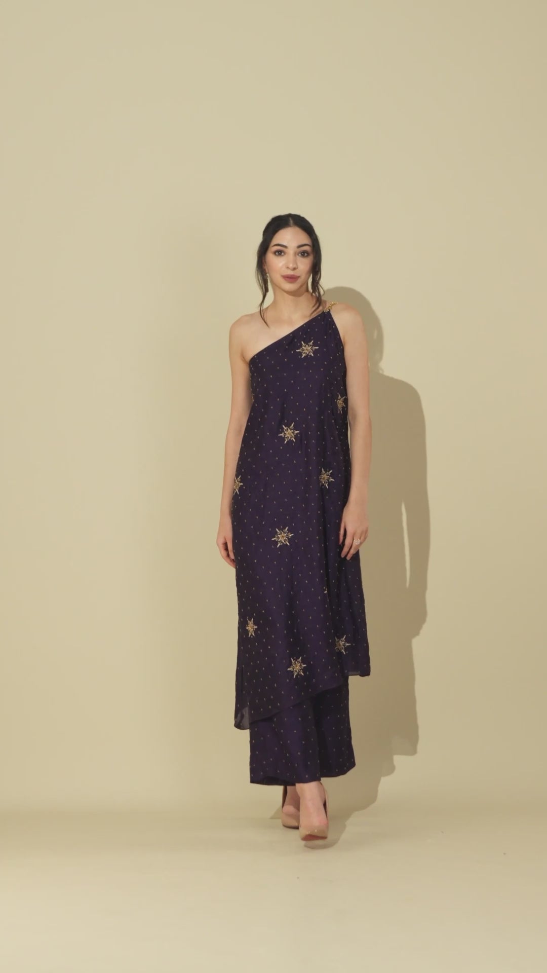 Vishwarupa One-Shoulder Kurta and Pants Set in Purple – Experience the cosmic charm of the Vishwarupa Set, a stunning fusion of modern design and celestial beauty. Inspired by the galaxy, this one-shoulder kurta features star-like patterns and intricate detailing, creating a dreamy, otherworldly look. Crafted from luxurious georgette fabric, the set is paired with flattering pants that enhance its graceful silhouette. The rich purple hue adds depth and elegance, making it a perfect choice for parties, evening events, or special occasions. With its unique design and stellar appeal, the Vishwarupa Set is sure to make you shine like the stars.